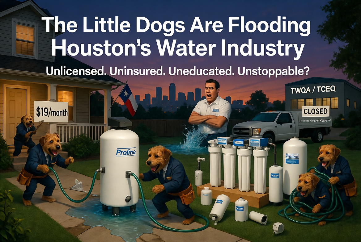 Yet right now the Houston market is being flooded by what I call the “Little Dogs”: unlicensed, uninsured, untrained operators who sell and install water equipment at a fraction of real industry pricing. They are not “competitors.” They are opportunists who ignore or have discovered a loophole that the Texas Water Quality Association (TWQA) and the Texas Commission on Environmental Quality (TCEQ) have either been unwilling or unable to address.